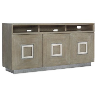 Create an accountCasual, natural, and tactile, the Affinity Entertainment Console is constructed of Oak Veneers with a greige sand-blasted finish on Quartered Oak Veneers with pewter hardware and antique white accents. Featuring 3 doors with soft-close hinges, the console has one adjustable shelf behind the left door and one adjustable shelf behind the pair of right doors. There are 2 partitions that create 3 open media storage areas. The partitions sit back 6 inches to allow for a soundbar. Ventilated back panel and an FC705 3-plug electrical outlet on the right side. Soft, rounded forms combine with sand-blasted greige and antique white finishes to create an inviting transitional boutique collection in Affinity. The main finish for the 20-piece collection of bedroom, dining room, occasional, accents and home entertainment is a wire-brushed greige (gray/beige) on quartered white oak. Pewter and antique white hardware and soft linen fabrics add intrigue.