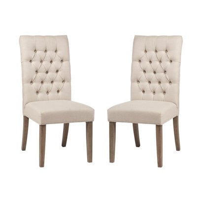 Create an accountThis set of two wood and fabric tufted parson chairs has a handsome rustic design. Each chair is crafted with durable rubberwood and plywood. Stylish elements shine through in the sand-colored linen-like fabric upholstery and tufted seat back. A warm vineyard oak finish completes the look of this charming set. You'll love the versatility that makes these chairs well suited for both everyday or formal dining.