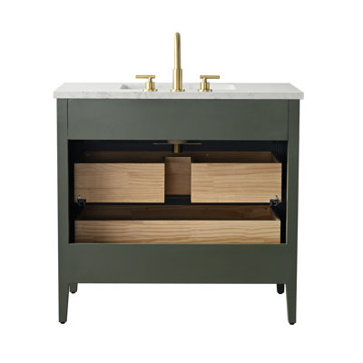 Create an accountThis single vanity set is your ticket to a stylish and organized bathroom upgrade, especially in smaller spaces. With its Arabescato engineered stone countertop and fluted design, it brings a trendy vibe to your space. The solid and engineered wood base is paired with brushed bronze hardware, adding a sleek contrast to the solid finish. Two soft-close drawers offer ample storage for all your essentials, while the undermount ceramic sink keeps things streamlined. The rectangular sink is centrally located, making it easy to wash up. Ready to make a statement? Pair it with an 8" widespread faucet to complete the look.