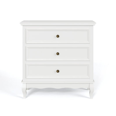 Create an accountThis 3-drawer dresser updates your space with extra storage and a classic French country look. Made from engineered wood with a crisp white finish, the chest features a horizontal orientation and a finished back for easy placement. The three spacious drawers with poly trim are equipped with metal slides for smooth operation, allowing you to easily access your books, clothes, or linens. Cabriole legs elevate the dresser, keeping it away from moisture and allowing extra space underneath for shoes or a robotic vacuum cleaner. To keep your dresser looking its best, simply wipe it clean with a dry cloth.