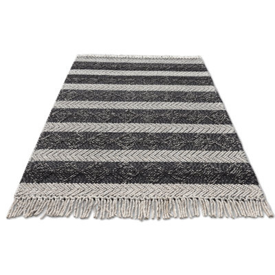 Bubble Geometric Handmade Black White HighLow Diamond Striped Wool Tasseled Area Rug By Tufty Home