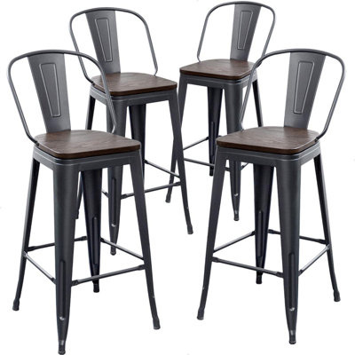 Create an accountThis set of four counter-height stools pairs clean lines with a utilitarian edge, ideal for kitchens, breakfast bars, or casual dining spaces. Each stool features a contoured wooden seat with visible grain that adds natural texture and warmth. The black metal frame includes a built-in footrest and flared legs for added stability. With armless profiles, they tuck easily under counters to help save space. Plus, the stackable design makes storage simple, whether you're cleaning up after guests or rearranging your space.