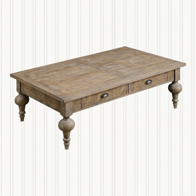 Create an accountCapturing the feel of the French countryside, this charming coffee table is the perfect piece for your living room or den. Crafted from solid and engineered wood, this coffee table features a sandstone gray finish for a weathered look and wrought iron-inspired hardware for a hint of old-world charm. Some seriously stylish turned legs and carved details also give this piece a traditional look. Plus, it features two drawers that are perfect for storing remotes, coasters, and decks of cards.