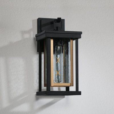Create an accountThis outdoor wall sconce will illuminate the way to your front door or backyard. The classic lantern design has an open rectangular iron frame paired with a seeded glass shade on all sides for a modern classic look. The combine sand black with deep gold finish adds a contemporary to your space. The exterior outdoor lights wall mount hangs from an elegant hook (Fixed to the light fixture). Use this outdoor sconce as a porch light to welcome guests at the door or as an outdoor wall-mount garage light to illuminate the room or as an exterior light on your patio for a dinner party.