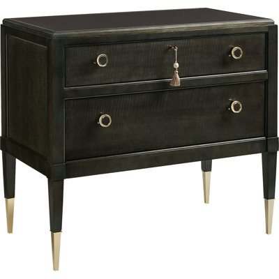 Create an accountThe clean, linear frame of this Charcoal Anegre nightstand gives off a streamlined air. The piece is punctuated by custom round Whisper of Gold pulls and tapered legs with gold ferrules. A dark glass top sits over three drawers, one of which is hidden for papers and valuables. The top drawer is lined in a taupe/charcoal herringbone pad. The golden key and tassel add an elegant touch to the locking drawer. It’s a Good Evening indeed when this piece is beside your bed.
