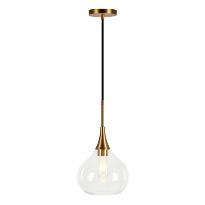 This 1-light pendant brings streamlined style and helpful illumination over kitchen islands, dining tables, and other areas around your home. The fixture is crafted from metal with a sleek solid finish. And it holds a single bulb (sold separately) that's surrounded by a teardrop shade made from clear glass to complete this modern design. It hangs with the help of a height-adjustable cord and is compatible with dimmer switches, letting you control the level of brightness in any space.
