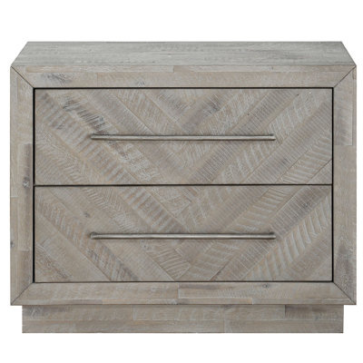 Create an accountThis nightstand comes from the roughhewn acacia used in its creation. Hand-selected planks of solid wood are carefully sanded, stained, and whitewashed for a driftwood appeal that accentuates the active grain and draws out natural knots and markings from the milling process. They are then inlaid over plywood to create a handsome herringbone pattern and finished with thin metal bar pulls for the crowning contemporary touch.