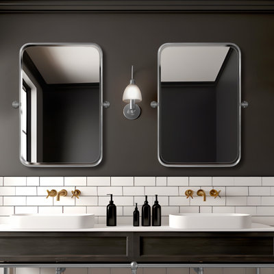 Create an accountThis pair of wall mirrors brings a blend of modern design and timeless appeal to your bathroom or vanity space. Crafted from sleek aluminum alloy, the rectangular frames with rounded edges come in the size and color of your choice to best suit your taste. Designed for damp, dry, and wet locations, these mirrors come with beveled glass and a double-layer backing that liven up your bathroom, entryway, or guest bath. But the best part? They have pivots that can be tilted up and down to adjust the viewing angle for standing or seated use.