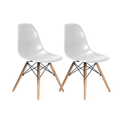 Create an accountArriving as a 2-piece set, this side chair brings a mid-century vibe to your dining area or living room. Crafted from matte-finished molded plastic in a solid hue, the bucket seat features a full backrest and a sleek waterfall edge. It's supported by an Eiffel-style base consisting of angled solid wood legs with architectural stretchers that lend stability and support. Foot caps help prevent scuffs and scratches of hardwood floors. Each water-resistant chair can accommodate up to 250 lbs.