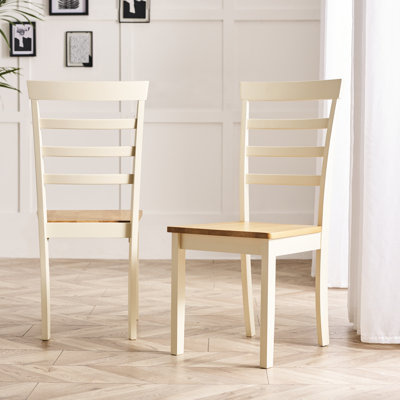 Create an accountThe solid wood construction and ladder-back design give this pair of dining chairs a balanced, traditional look. The frames features a neutral finish that showcases the natural wood grain variation for added texture. This set of two chairs is versatile enough to coordinate with various design aesthetics, ranging from farmhouse country cottage to boho or Scandi-industrial. What's more, integrated plastic glides help protect your floors from scuffs and scratches during daily use. We love how the clean-lined silhouette works well with a variety of table shapes for easy styling.